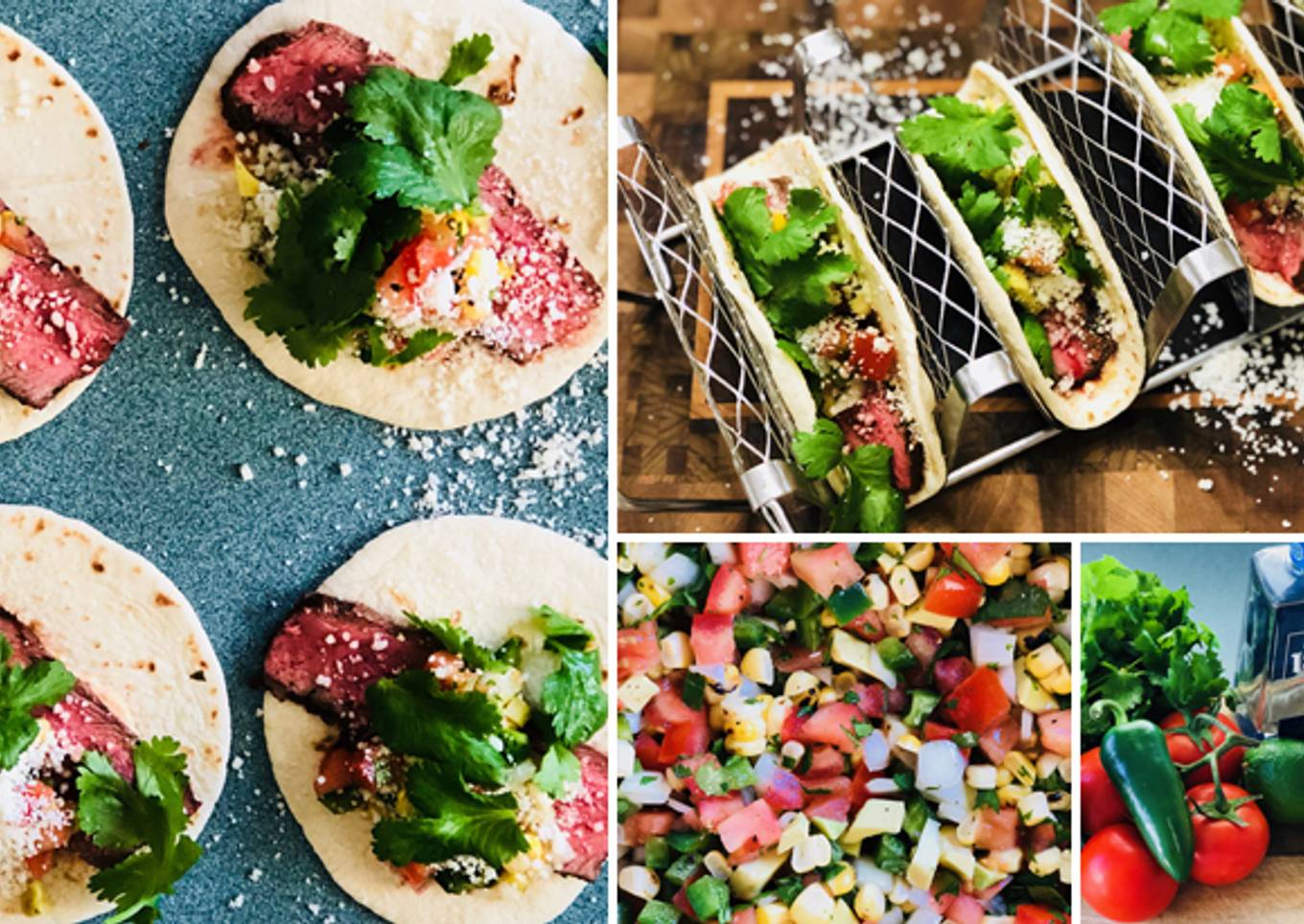 To assemble the Tequila Fullblood Wagyu beef tacos, begin by gently warming the tortillas on the grill for 15 seconds.Then, place some sriracha aioli on top of the tortillas.Add a couple slices of marinated and grilled Fullblood Wagyu chuckeye steak. Top with the avocado corn salsa, cotija cheese, and fresh cilantro.Serve warm, and enjoy!
