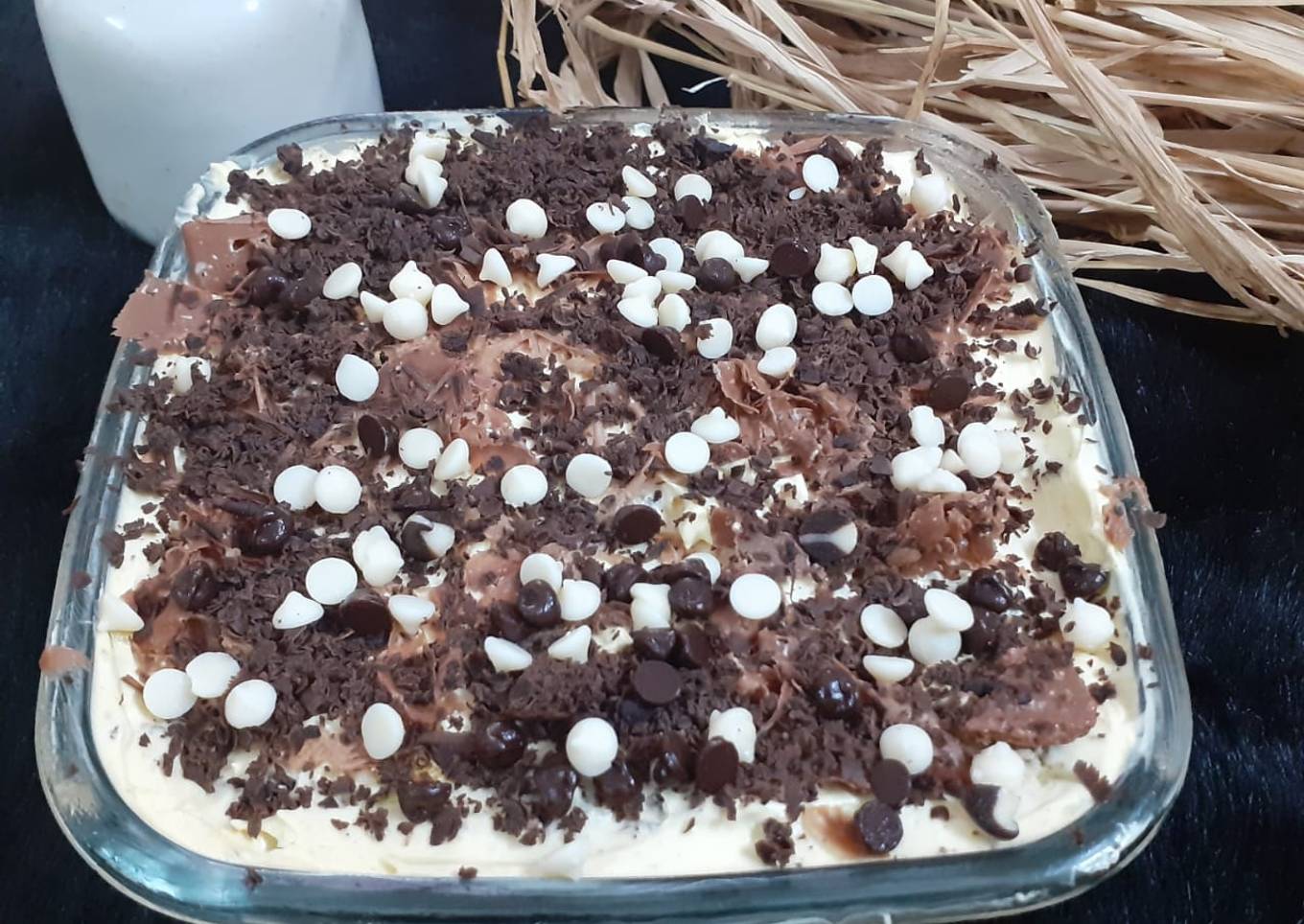 - For assembling the dessert.take a glass bowl, add little melted chocolate mixture to it. Top with biscuits dipped in coffee mixture and then icing with cheese dessert mixture. Repeat the same process to make one more layer. Leave it to cool for about 3-4 hours. Dust it with coco powder.(here I used chocolate shavings and choco chips as my family don't like cocoa powder)